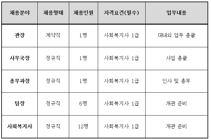 공통자격 | o 응시 연령, 성별 제한없음 단, 보건복지부 사회복지시설 관리안내(지침)에 의거 60세 이하인 자 o 다음의 결격사유에 해당하지 않는 자 ∙사회복지사업법에 따라 사회복지시설 종사자 결격사유에 해당되는 자 (법 제35조의2제2항) ∙ 채용신체검사에 부적격 판정을 받은 자 ∙ 범죄 및 성폭력범죄, 노인/장애인 학대 관련 조회 시 결격사유가 없는 자 | |
